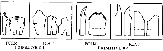 Unlike "dress forms" or mannequins now used in industry, Primitive Forms do not emulate the shape of the body, but rather represent the shape of the cloth which must be cut to cover the body with necessary "ease" (allowance of motion, fit, and aesthetic appeal). The forms vary in their adherence to the shape of the body underneath, and in their method of assembly. Final apparel styles are designed through a sequence of modifications performed on these primitives. In one test of industry compatibility using styles from a number of different designers, Stylometrics primitives were found to be able to represent 413 out of 414 garments tested. [5.Willett, 1989]