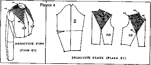 In addition to chunking styles by their seminal primitives, a prototypical CAD/expert system now being developed at Boston University breaks Stylometrics primitives themselves down into "cells," which encompass interdependent parts of a garment. One section of a cell cannot be altered during primitive modification without another complimentary section (or sections) of the same cell being altered as well. To do so would be to design an un-manufacturable, or unwearable, garment. One cell is shaded in Figure 4. [6. Willett, 1991].